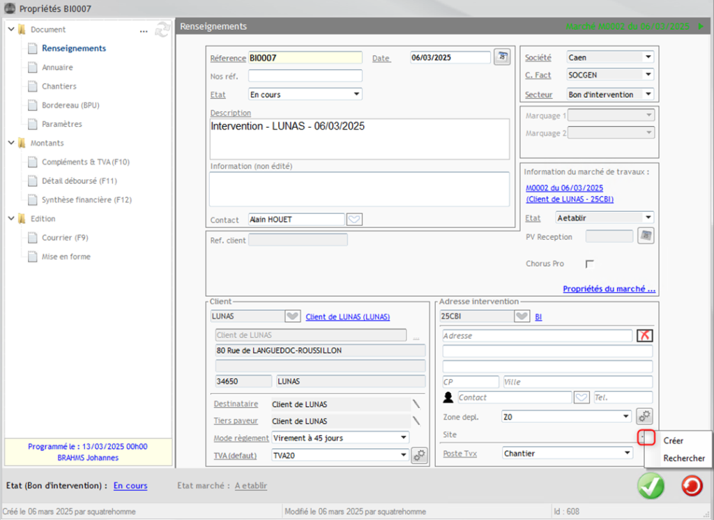 L’adresse du site remonte automatiquement dans l’encadré Adresse Intervention.