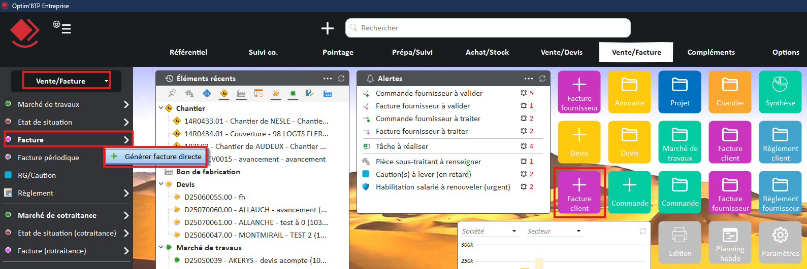 Si vous avez besoin de facturer un devis directement sans avancement ou de faire des factures en dehors d’un marché sur un chantier, il est possible dans Optim’BTP Entreprise de générer des factures directes.