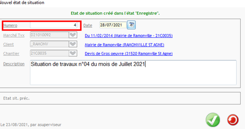 Dans l’exemple ci-dessous la dernière situation facturée est la situation n°4 du mois de juillet, donc il faut l’indiquer dans le numéro et mettre la date où la situation a été faite